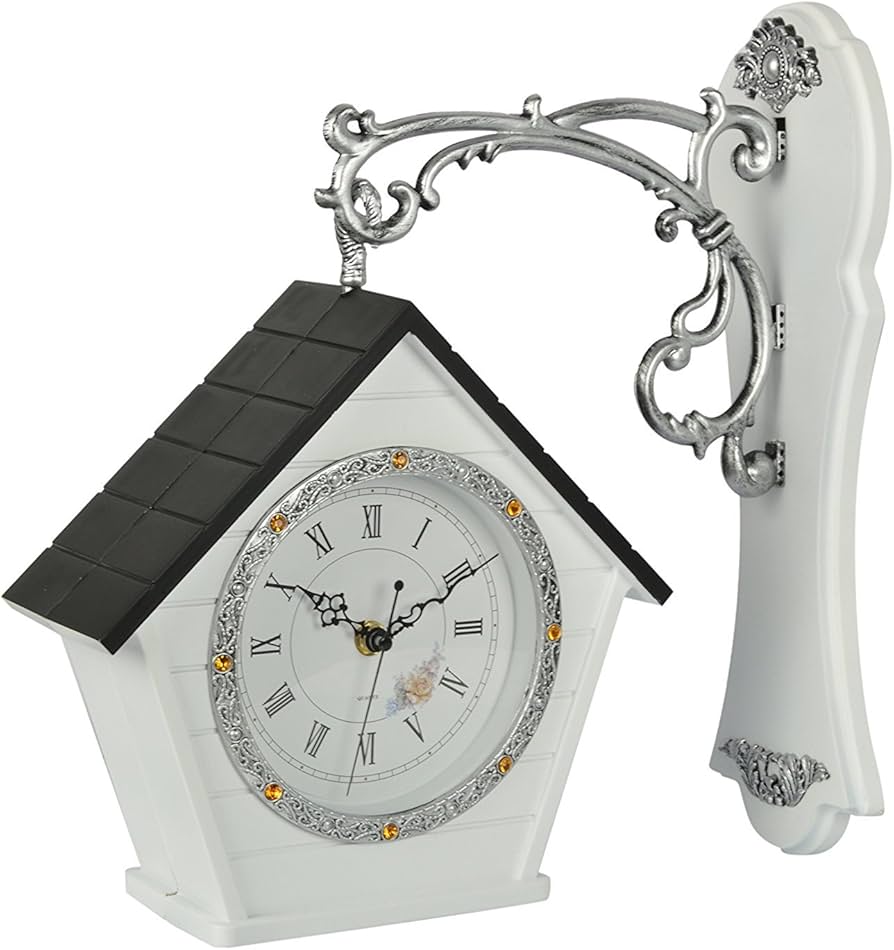 Elegant vintage-style hanging wall clock with ornate metal bracket and house-shaped design. Adds a timeless and sophisticated touch to any living room, hallway, or cafe interior.