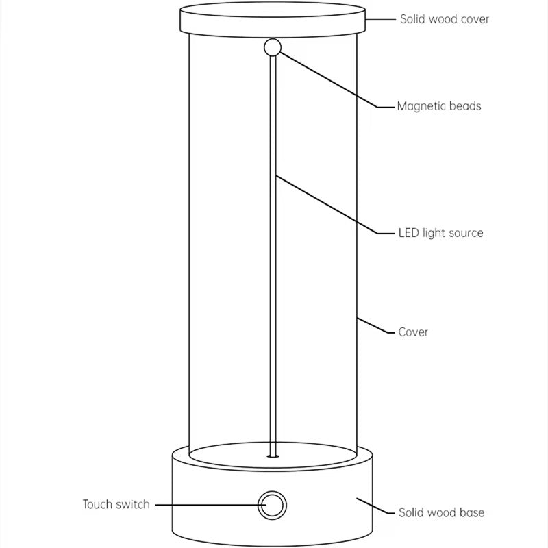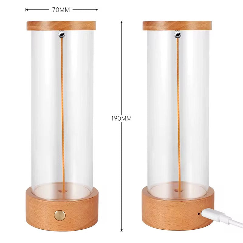 This minimalist table lamp features a sleek glass body and wooden base, with a unique linear LED light perfect for contemporary and modern workspaces.