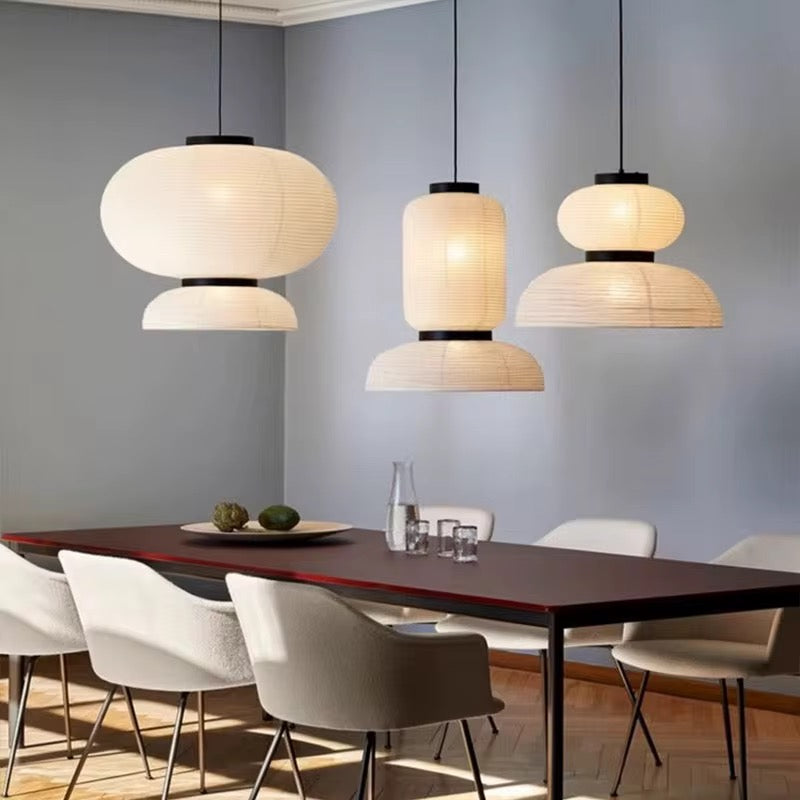 These elegant modern pendant lights feature a natural bamboo shade with black accents, perfect for bringing a touch of minimalistic charm to any dining or living space.