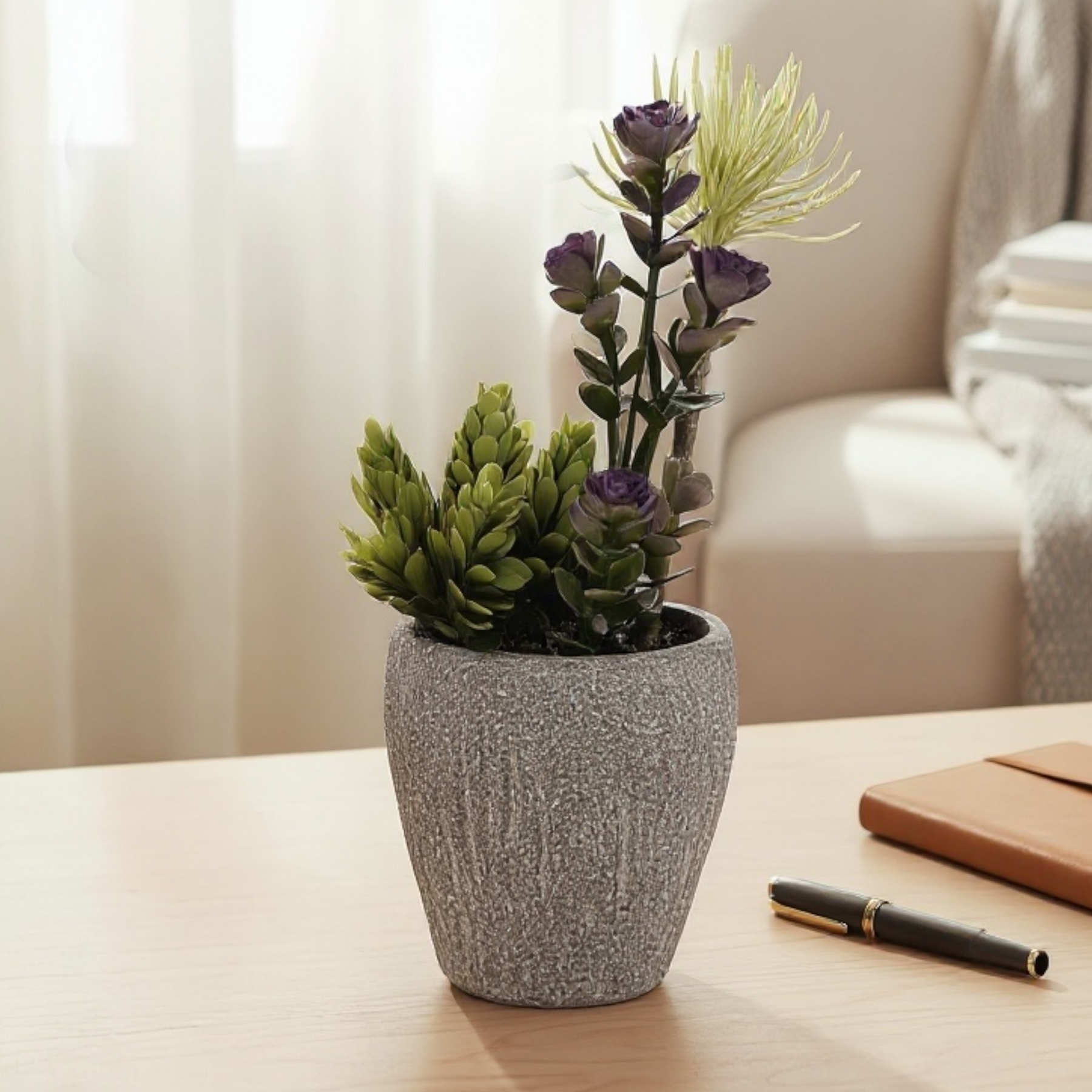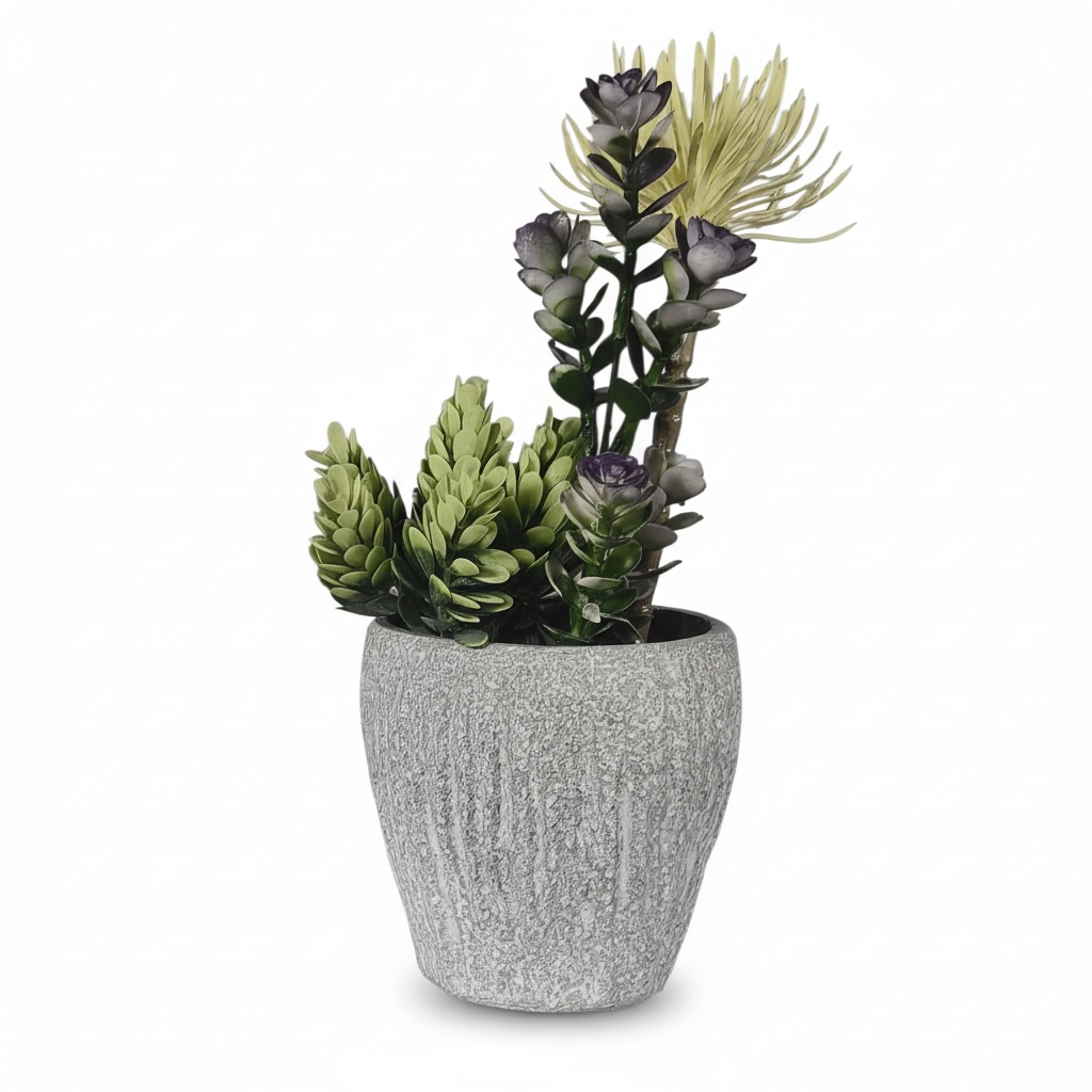 Add a modern decorative touch with this artificial succulent and purple floral arrangement. Featuring layered greenery, sculptural succulents, and delicate purple accents set in a textured ceramic pot, it delivers a realistic, stylish look without any maintenance. Perfect for desks, shelves, or coffee tables, this piece brings color and texture to contemporary interiors year-round.